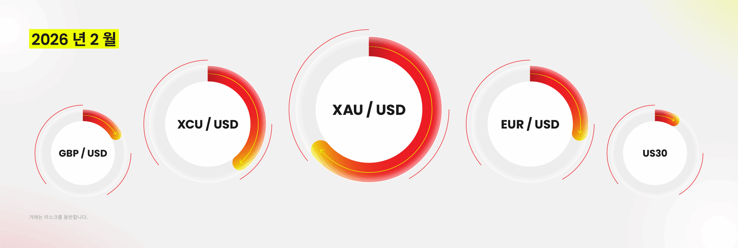 이러한 환경 속에서 현물 금(XAUUSD) 시장은 1월의 기록적인 급등락 이후 2월 들어 점차 횡보 조정 흐름으로 돌아섰습니다. 금 가격은 2월 초 1월 말 반등 흐름을 이어가며 한때 온스당 5,000달러를 다시 상회했지만 미 연준의 1월 회의록에서 매파적 신호가 확인되고 케빈 워시 지명 이후 정책 방향 전환에 대한 시장 기대가 높아지면서 점차 하방 압력을 받았습니다. 이에 따라 금 가격은 월중 최저 온스당 4,400달러 수준까지 하락했습니다. 변동성은 1월만큼 크지 않았지만 금은 여전히 대표적인 안전자산이자 투기적 거래 자산으로서의 특성 덕분에 해당 월 가장 활발하게 거래된 상품 중 하나로 거래량 상위권을 유지했습니다.