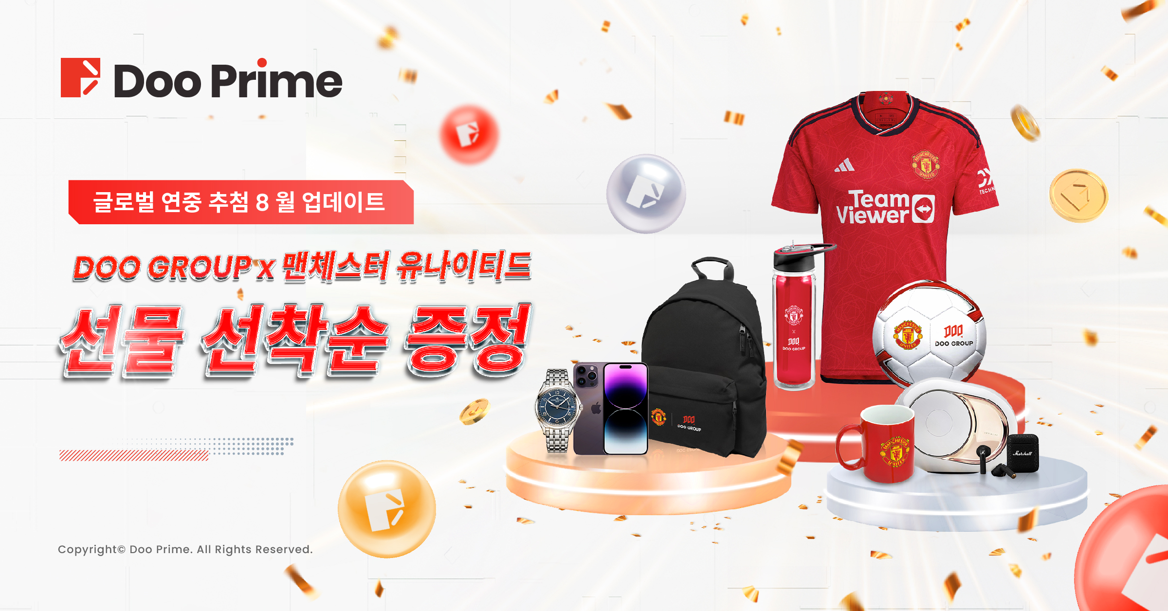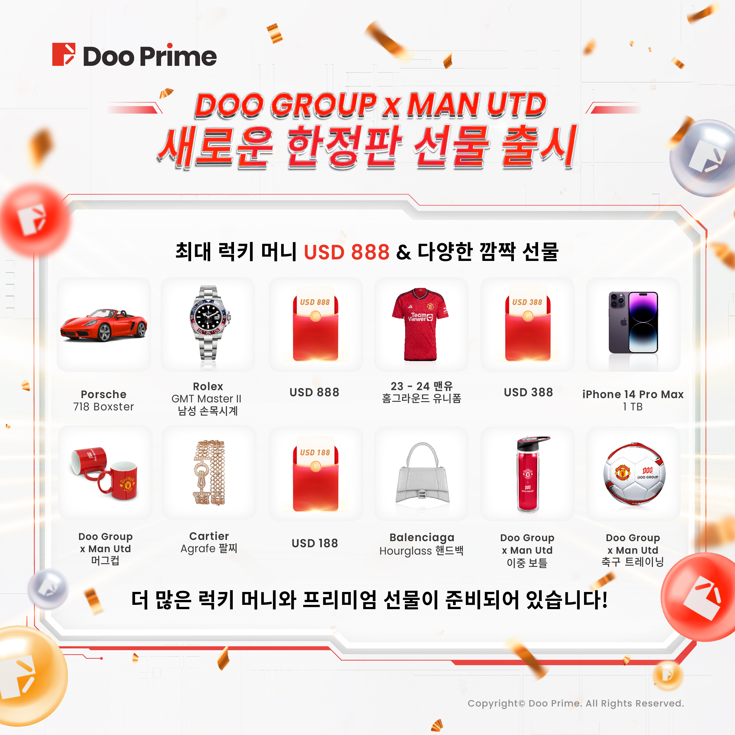글로벌 고객님들에게 보다 프리미엄의 체험을 제공하기 위해 지속적으로 업그레이드하여 브랜드 활동을 추진하고 있으며, 맨체스터 유나이티드와의 글로벌 파트너십을 통해 고객님들에게 더 많은 혜택을 제공하고 있습니다. 잉글랜드 프리미어리그의 새로운 시즌을 맞아, Doo Prime의 산하 그룹인 Doo Group은 맨체스터 유나이티드(맨유)와 함께 일련의 브랜드 콜라보 선물을 출시하여 많은 Doo Prime 고객님들에게 새로운 프리미엄 브랜드 선물로써 감사의 뜻을 전하고 있으며, 수년간의 지질과 신뢰에 감사드립니다.