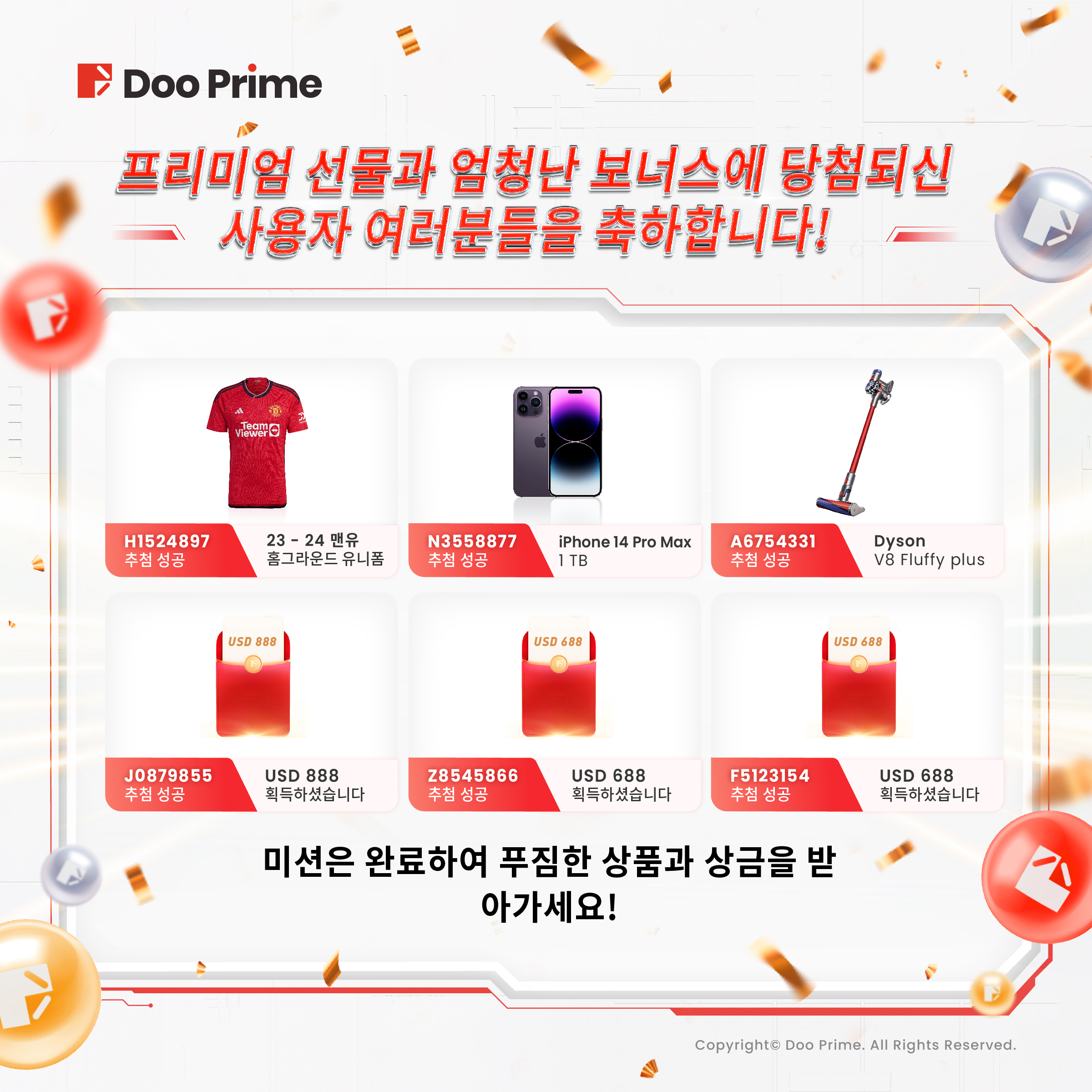 우리가 정성껏 준비한 많은 서프라이즈와 혜택들은 전 세계 고객님들의 열렬한 한호를 받았고, 이미 많은 행운 고객님들이 성공적으로 당첨되셨습니다. 23-24년 맨유의 뉴 시즌 정품 홈그라운드 유니폼, 아이폰 14 프로 맥스 1TB, 다이슨 V8 Fluffy Plus, USD 888 럭키 머니까지. 수상하신 고객 여러분들께 축하의 인사를 드리며, 당첨되신 선물들은 현재 순차적으로 배송이 되고 있습니다. Doo Prime 또한 더 많은 고객님들이 다양한 프리미엄 선물과 행운의 보너스에 성공적으로 당첨되셔서 한 여름의 아름다운 추억을 선사하기를 기대합니다.
