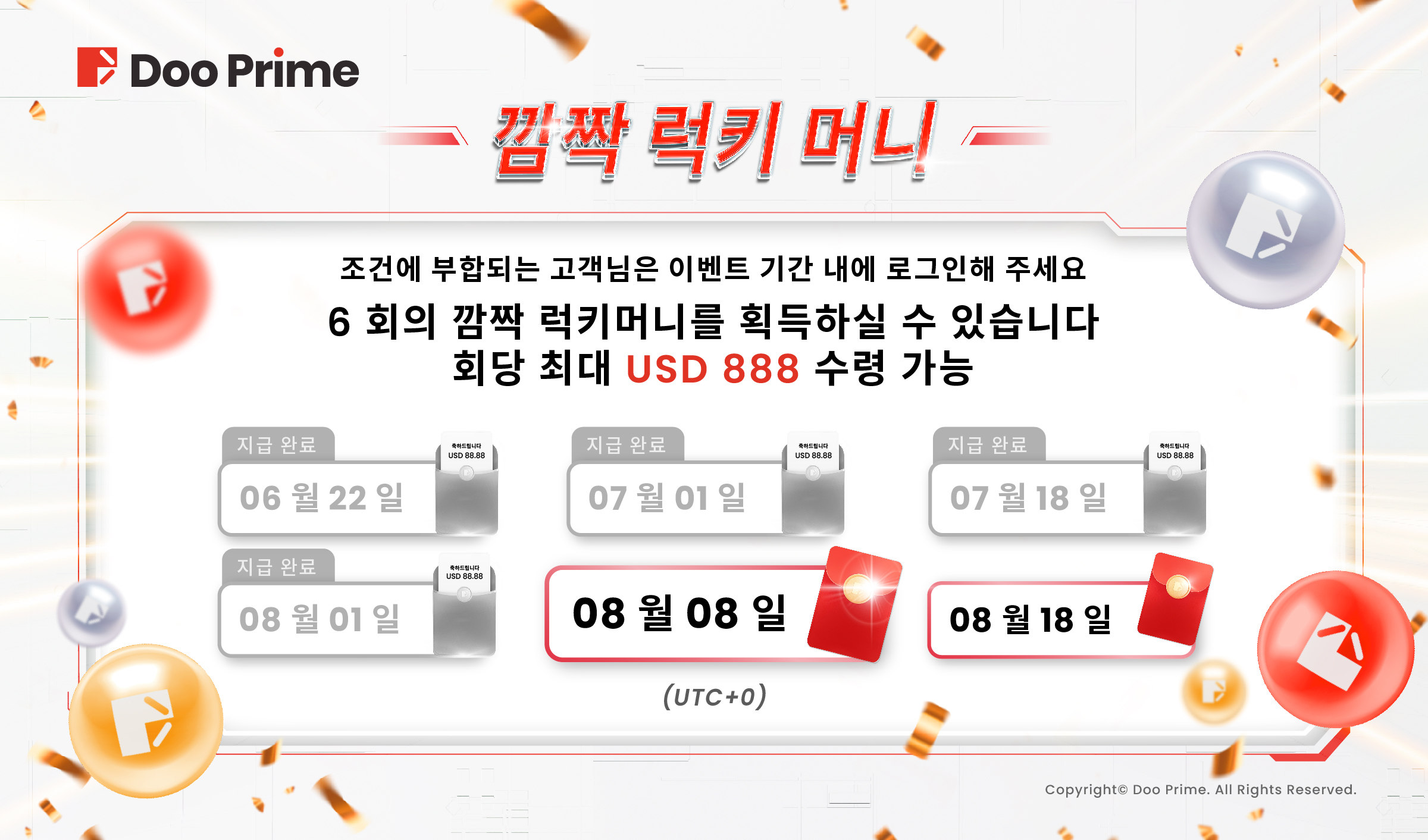 동시에 우리는 8월 8일과 18일 총 2회의 러키 머니를 증정할 예정입니다. 일 회 최대 당첨 금액은 USD 888입니다! 언제나 행운이 따르시길 바라겠습니다. 지금 바로 참여하시고 최종 이벤트 상의 주인공이 되세요!