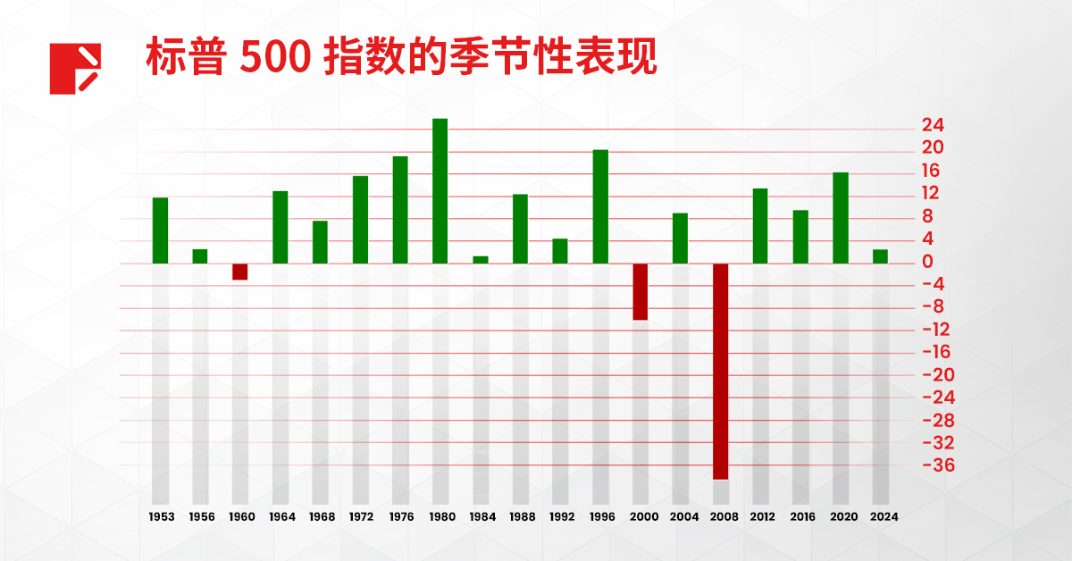 纵观过往选举年的表现,股市在 1960 年、2000 年和 2008 年实现负收益,均是由经济衰退造成的。