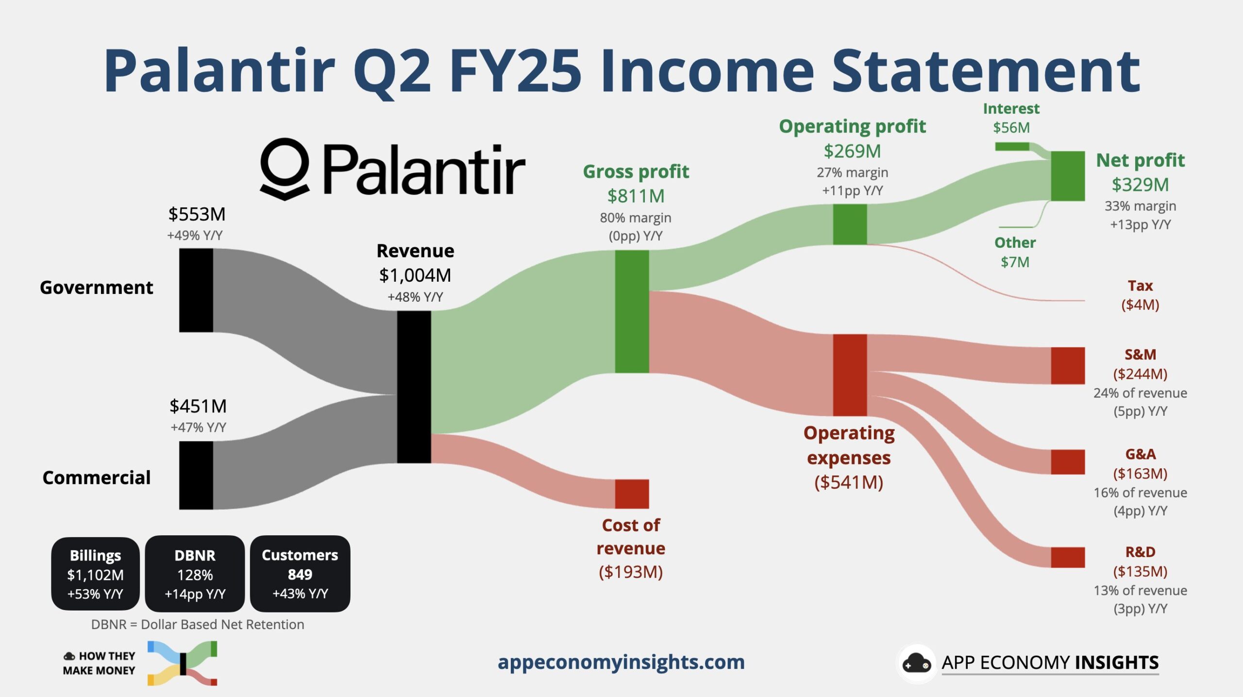 有 “AI 大牛股” 之称的大数据分析软件巨头 Palantir 公布二季度财报,营收首次突破 10 亿美元,超出市场预期,同比增长达 48%。其中,美国商业营收同比大增 93% 至 3.06 亿美元,美国政府合同营收同比增长 53% 至 4.26 亿美元,增速均高于上季度。