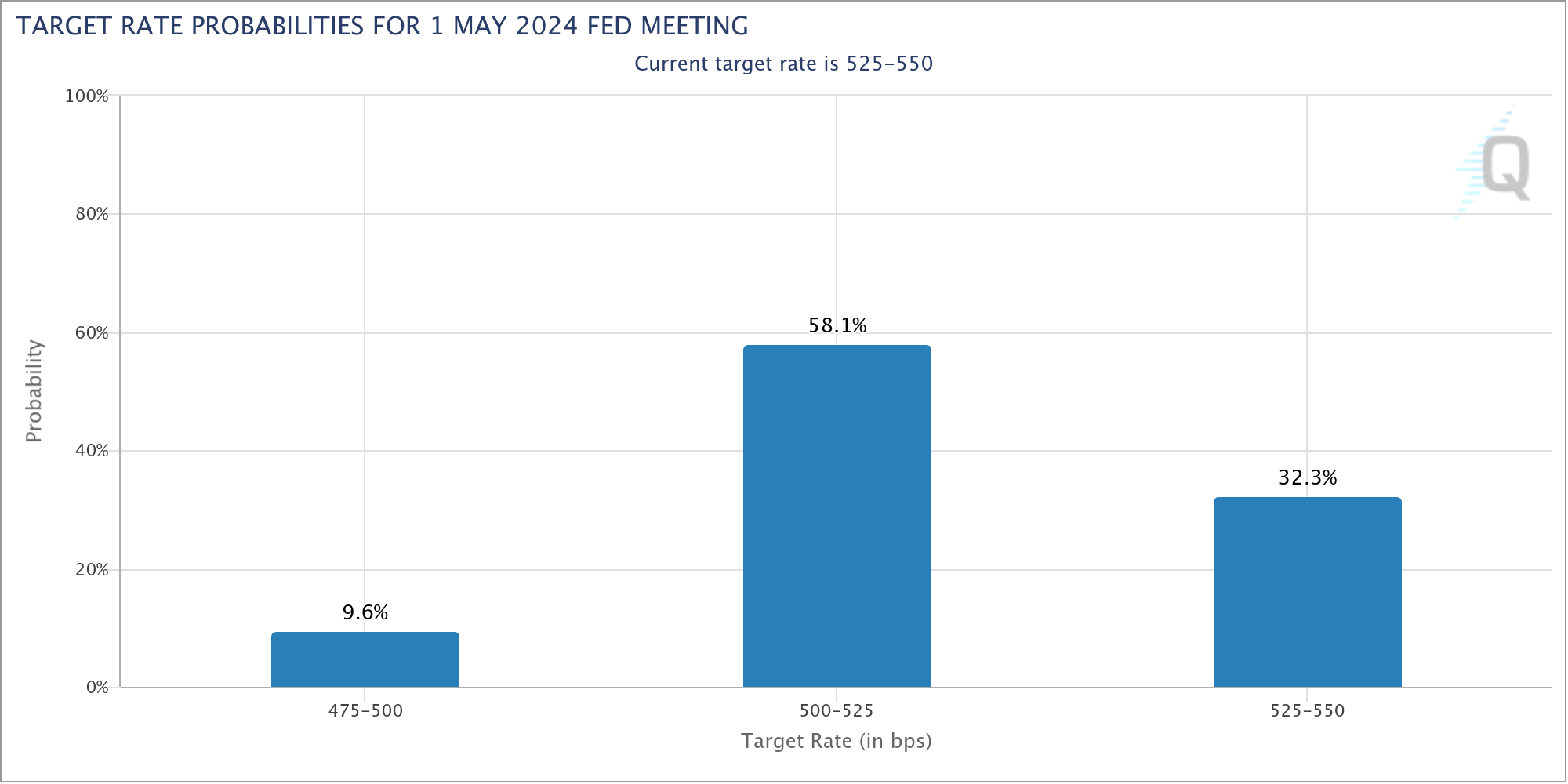 在鲍威尔发表上述言论后,市场对美联储 5 月降息的预期翻倍上升,近 60% 的概率降息 25 个基点,约 10% 的可能降息 50 个基点。