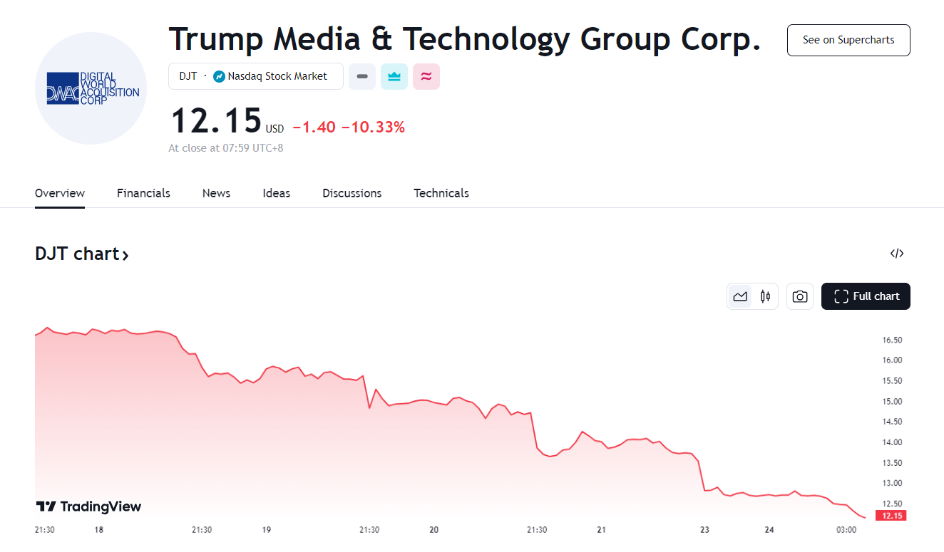 随着特朗普媒体科技集团(DJT.US)股份的“禁售期”已于 9 月 19 日到期,该股持续下跌。23 日,特朗普媒体科技集团股价收跌 10.33%,报 12.15 美元,为连续第六个交易日走低,且跌至 2021 年以来的最低水平。