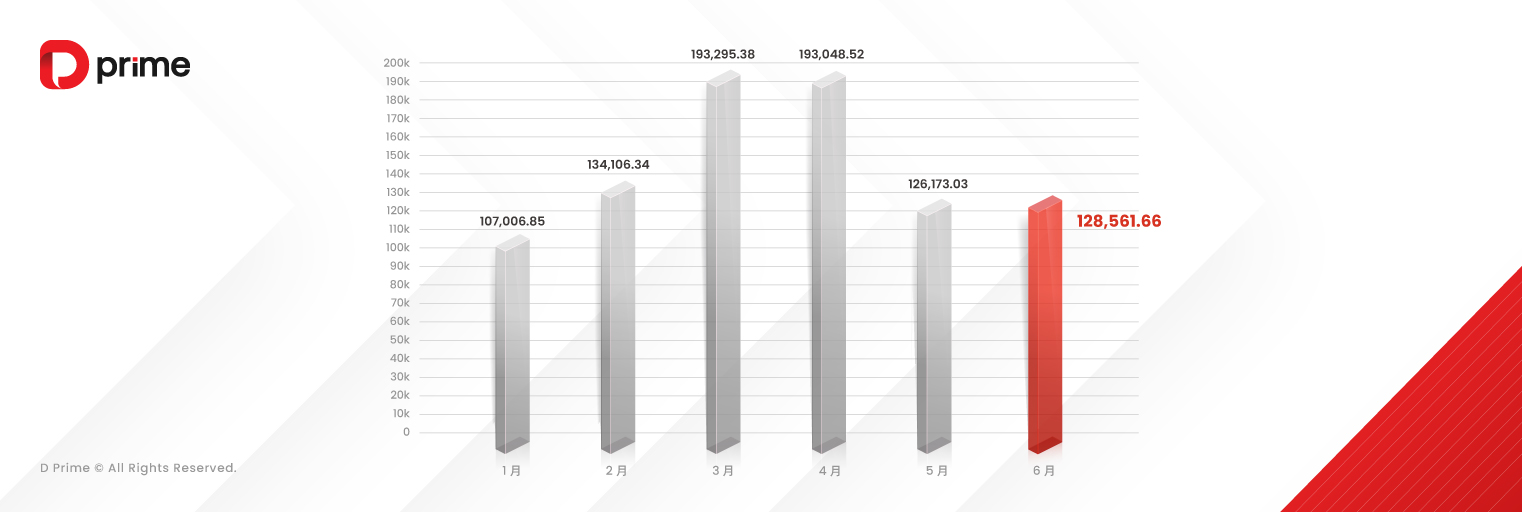 6月,中东局势、特朗普关税政策及减税法案等因素主导市场波动。受中东局势影响,金价与油价冲高回落,黄金及原油交易产品备受关注。同时,AI 引领的投资热潮推动美股走强,三大指数上行,NAS100(纳斯达克 100 指数)和 US30(道琼斯指数)再度跻身热门交易产品榜单。而受特朗普减税法案等政策预期压制,美元指数持续走软,欧元、英镑等主要货币持续回升,相关货币对交易活跃度不减。在市场热点快速轮动中,D Prime 始终以专业、高效的服务,助力用户追踪交易机遇。6 月总交易量实现同比增长约 21.79%,凸显在多变市场环境下的持续增长韧性。