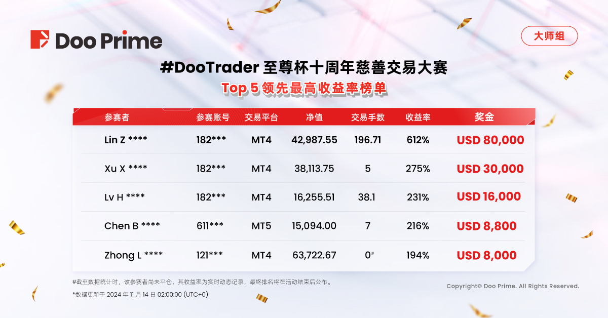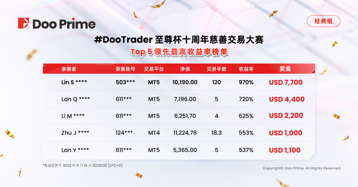 2024 #DooTrader 至尊杯十周年慈善交易大赛将于 12 月 24 日 23:59:59 ( UTC + 0 )截止报名。Doo Prime 欢迎各位选手立即前来参赛,把握制胜时机! 无论您是新手还是经验丰富的交易者,Doo Prime 期盼在每一轮比赛中见证新的交易传奇!