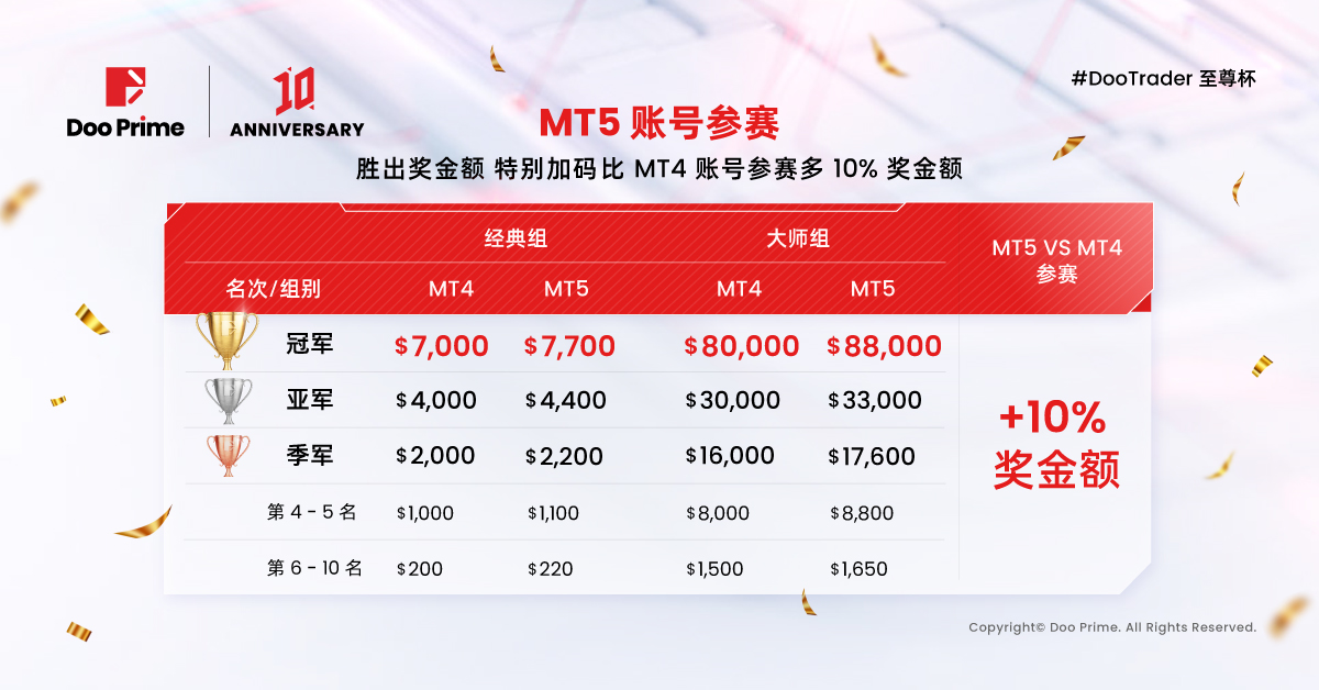 此外,Doo Prime 为了鼓励用户使用更高效的交易平台,凡使用 MT5 账号类型参赛的选手,将有机会获得特别加码 10% 的额外奖金,开启更优质的交易体验!