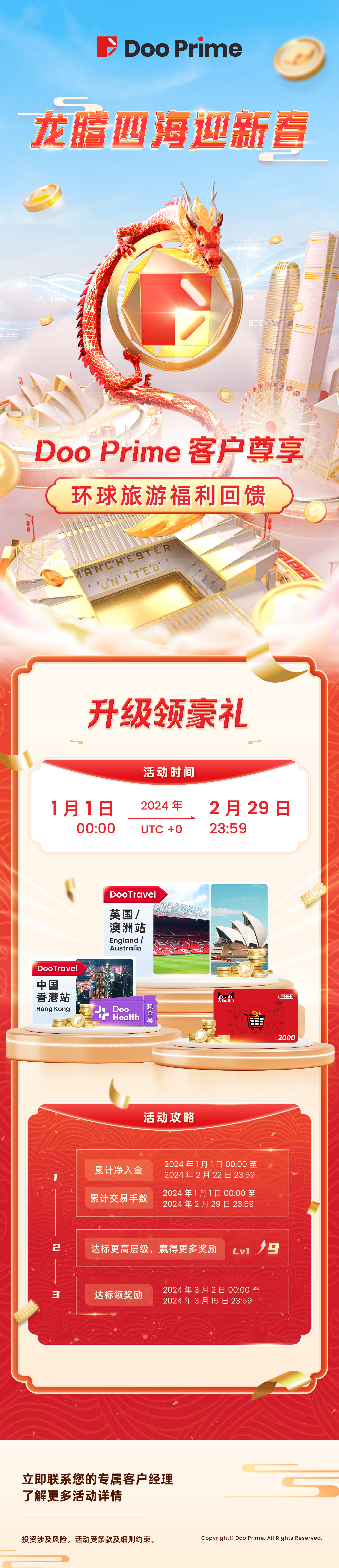 龙年将至,Doo Prime 将在 2024 年 1 月 1 日 00:00(UTC+0)起以创新升级的活动礼品,重磅开启 Doo Prime 客户尊享环球旅游福利回馈活动!