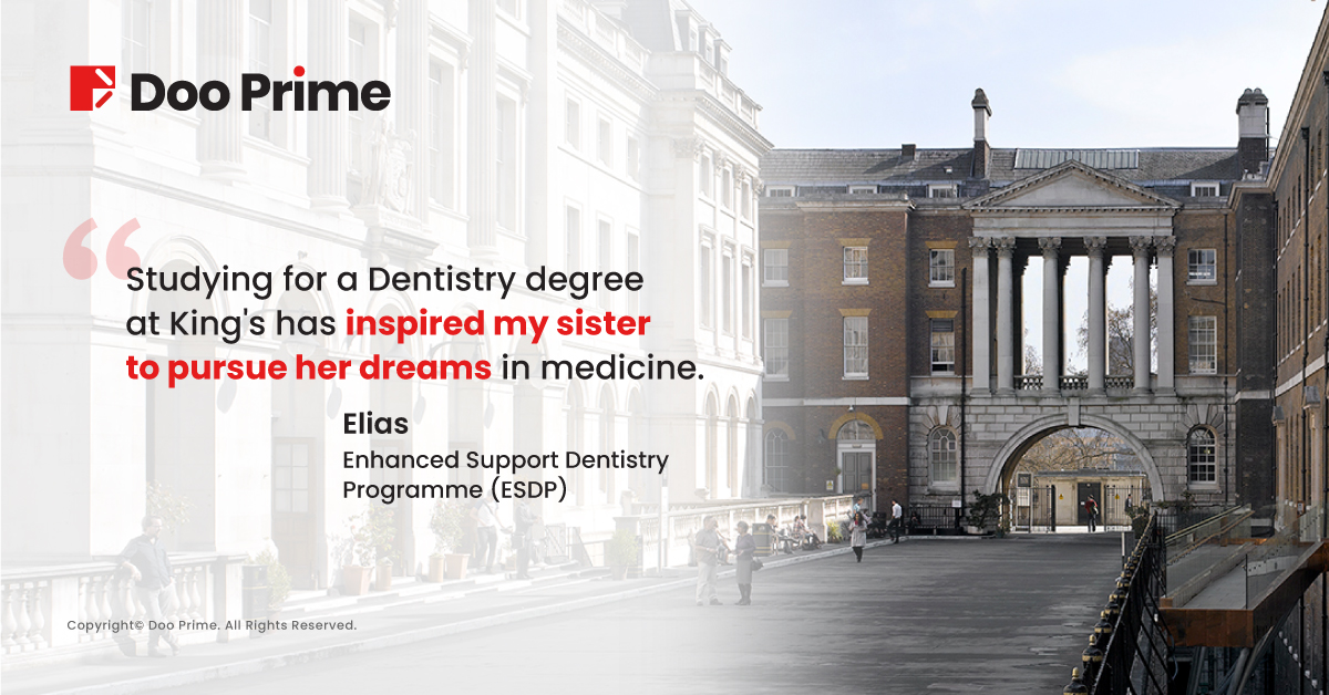 อีกทั้ง การที่ผมเรียนทันตแพทย์ที่ King’s เป็นแรงบันดาลใจให้น้องสาวของผมอยากที่จะประสบความสำเร็จด้วย เธอหวังว่าสักวันจะได้เรียนคณะแพทย์ที่ King’s เหมือนกัน”