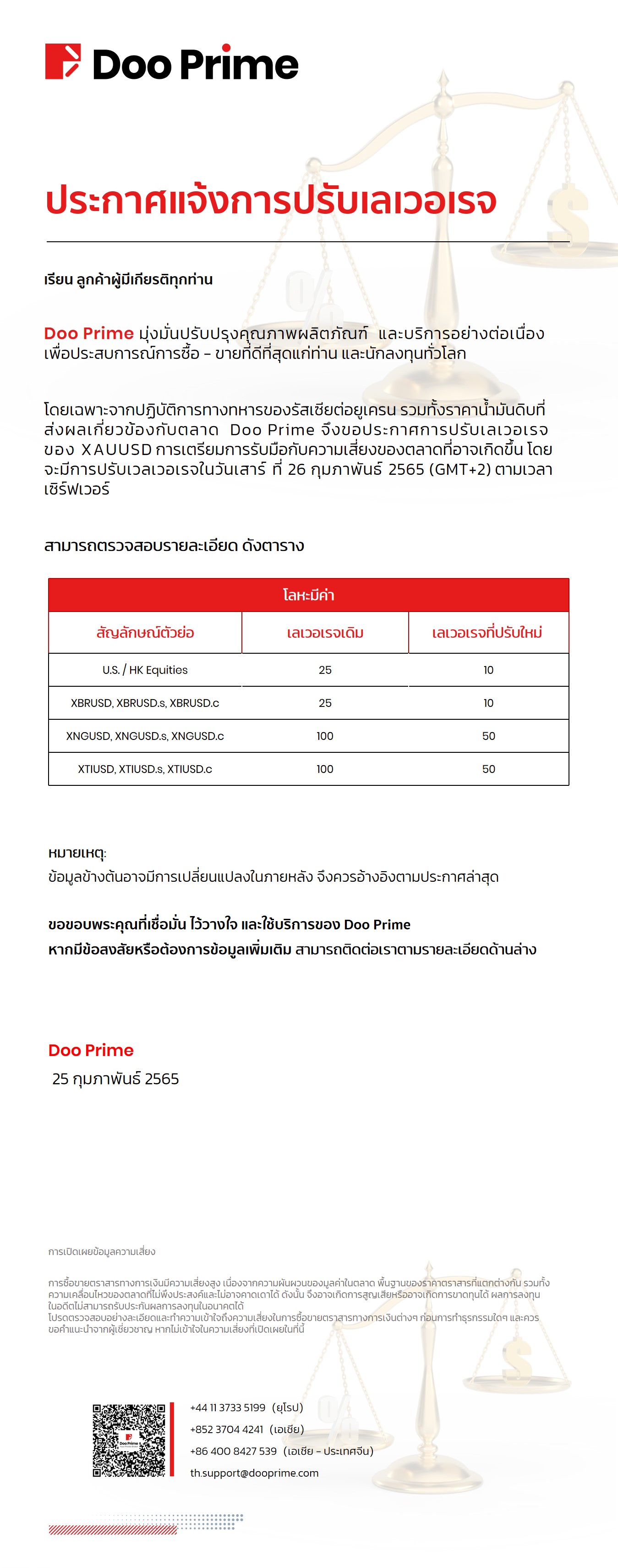 Doo Prime ประกาศแจ้งการปรับเลเวอเรจ