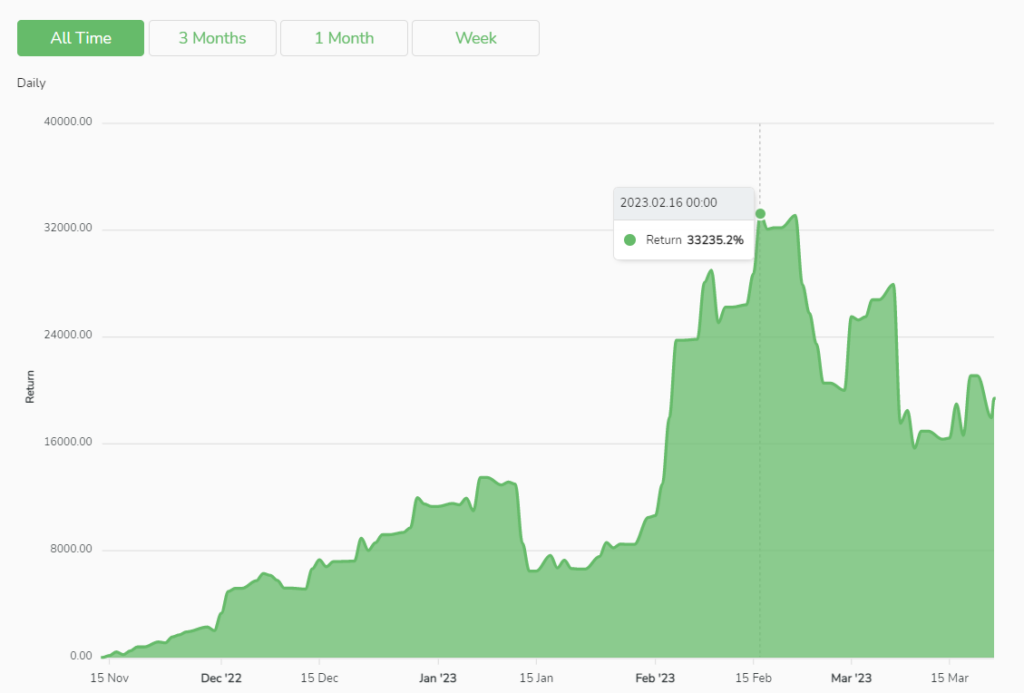 Xét về hiệu suất hàng tháng, người cung cấp tín hiệu giao dịch “Xiaoniu No. 0001” (小牛0001号) nhìn chung đạt các mức tăng ấn tượng trong tháng 11 năm ngoái, với mức lợi nhuận hàng tháng đạt 3,315.36%.