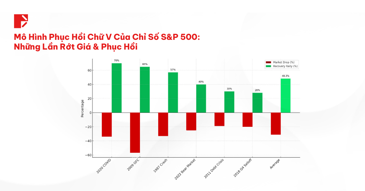 Trong lịch sử, chỉ số S&P 500 đã có vài lần phục hồi với mô hình chữ V đáng kinh ngạc. Trong đợt sụp đổ do COVID năm 2020, chỉ số này đã giảm hơn 30%, sau đó tăng vọt lên 70% trong thời gian ngắn kỷ lục. Vào năm 2009 – sau cuộc khủng hoảng tài chính toàn cầu, một đợt phục hồi tương tự cũng đã diễn ra với mức tăng 65%. Ngay cả vụ sụp đổ thị trường đầy tàn khốc năm 1987 cũng nhanh chóng chứng kiến mức tăng vọt theo sau là 57%.